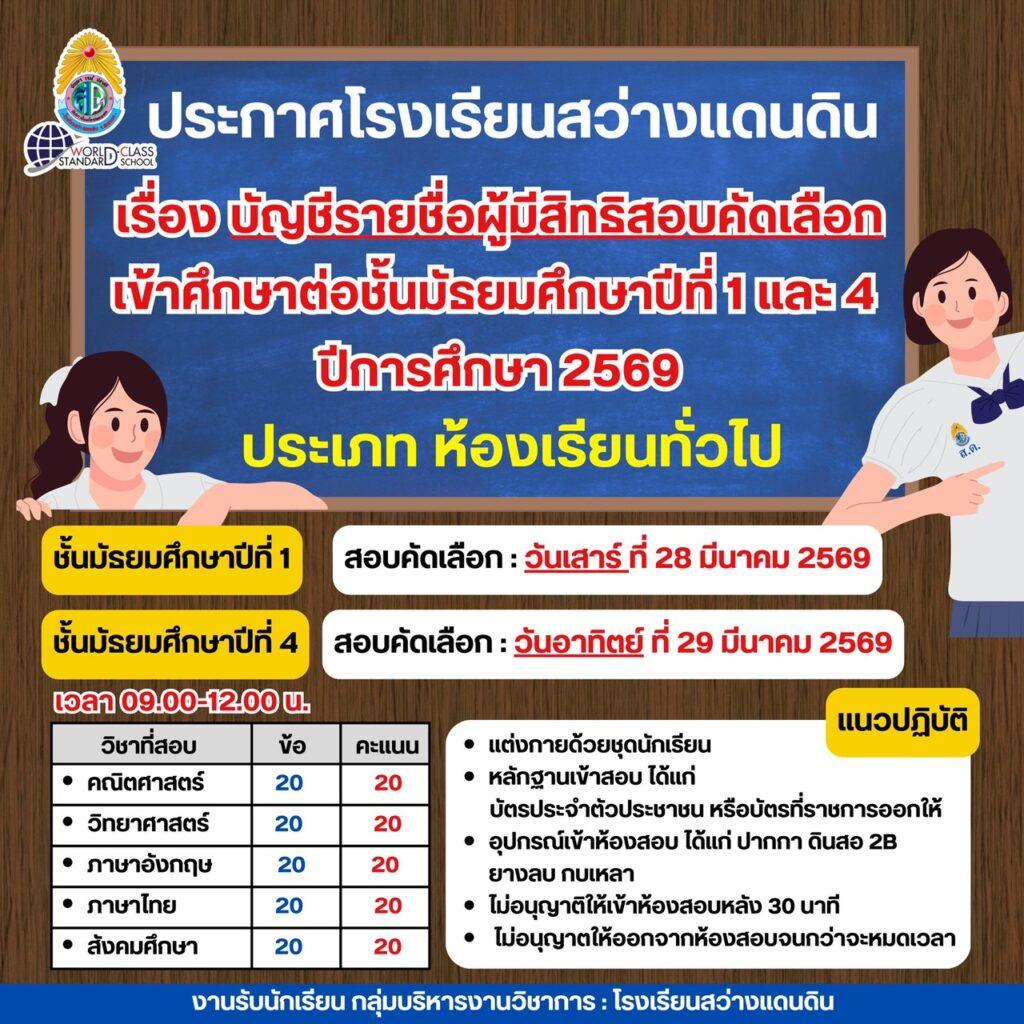 ประกาศโรงเรียนสว่างแดนดินเรื่องบัญชีรายชื่อผู้มีสิทธิ์สอบคัดเลือกเข้าศึกษาต่อชั้นมัธยมศึกษาปีที่ 1 และ 4 ปีการศึกษา 2569 ประเภทห้องเรียนทั่วไป